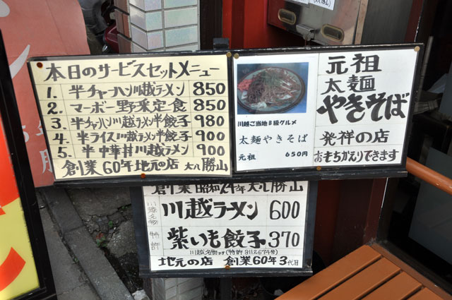 | 主なメニュー | 川越ラーメン 600円 紫いも餃子(5個) 370円 |
